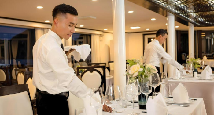 The onboard restaurant serves a harmonious blend of Vietnamese classics and international favorites. Guests can enjoy beautifully prepared set menus in a cozy dining atmosphere with panoramic bay views. The bar offers refreshing cocktails, wines, and local beverages—perfect for sunset or quiet evenings. Every meal onboard is crafted to highlight both flavor and presentation.