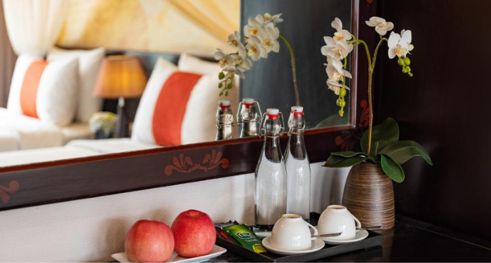 - Tea, coffee, bottled mineral water and amenities according to room standards.