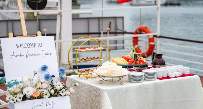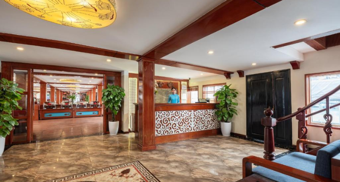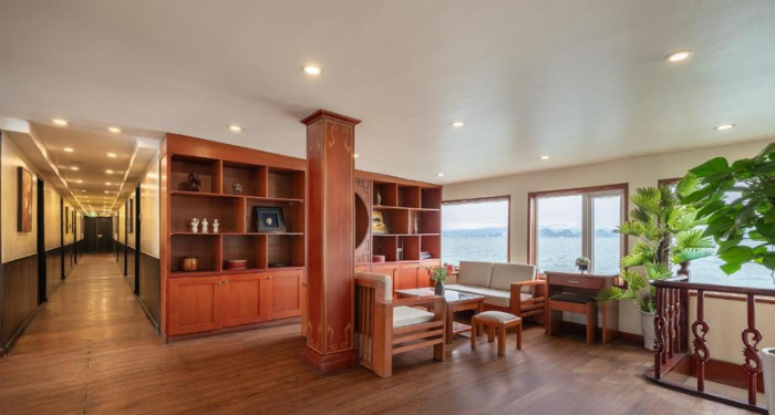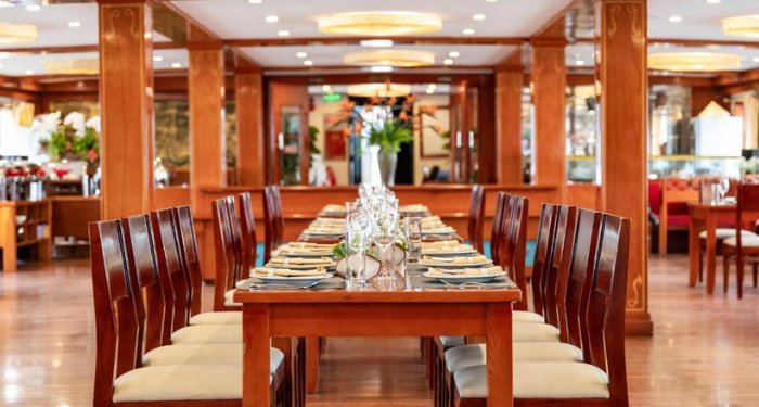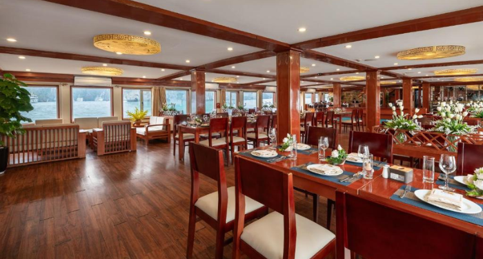 Located on the upper deck, the restaurant and bar offer a warm and stylish dining atmosphere. Menus blend Vietnamese flavors with contemporary Western cuisine, creating refined dishes inspired by both traditional and modern culinary trends. Guests can enjoy attentive service and a curated wine selection that pairs beautifully with each meal.