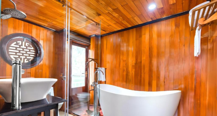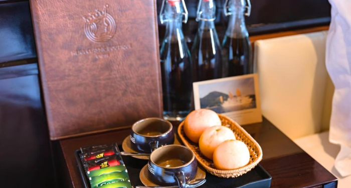 Guests aboard Hera enjoy refined facilities: a sundeck perfect for sunrise tai chi or sunset drinks, a spa with herbal foot-bath options, and a restaurant serving a mix of Vietnamese and international cuisine crafted from fresh ingredients.
