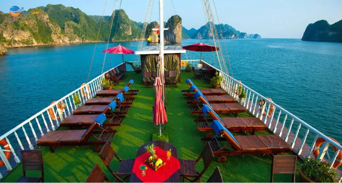 The incredible sun terrace with airy space, arranged 10 sun loungers is the most ideal area for visitors to relax. Lying on sun lounger, enjoying a glass of wine or cocktail, reading a book or just feeling peaceful Halong Bay - Lan Ha Bay give visitors the great experience.
