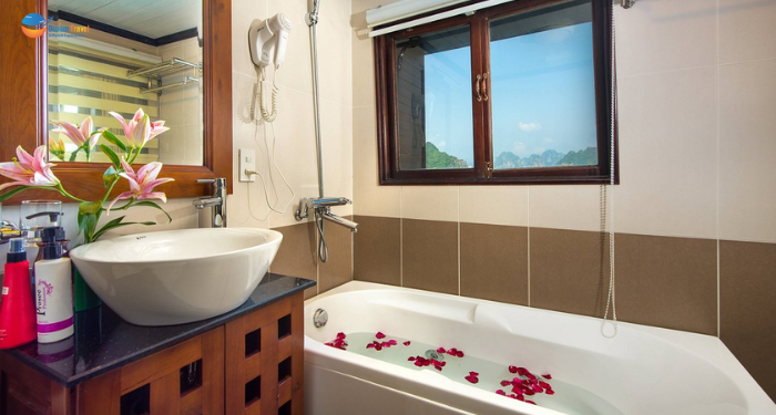 The incredible sun terrace with airy space, arranged 10 sun loungers is the most ideal area for visitors to relax. Lying on sun lounger, enjoying a glass of wine or cocktail, reading a book or just feeling peaceful Halong Bay - Lan Ha Bay give visitors the great experience.
